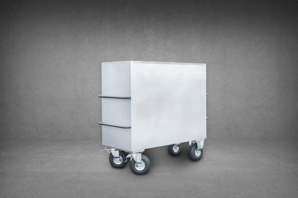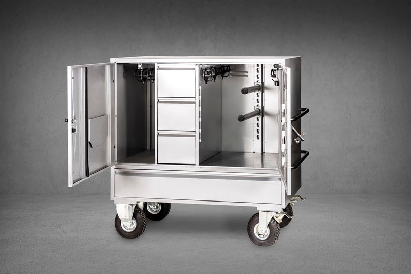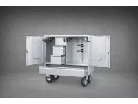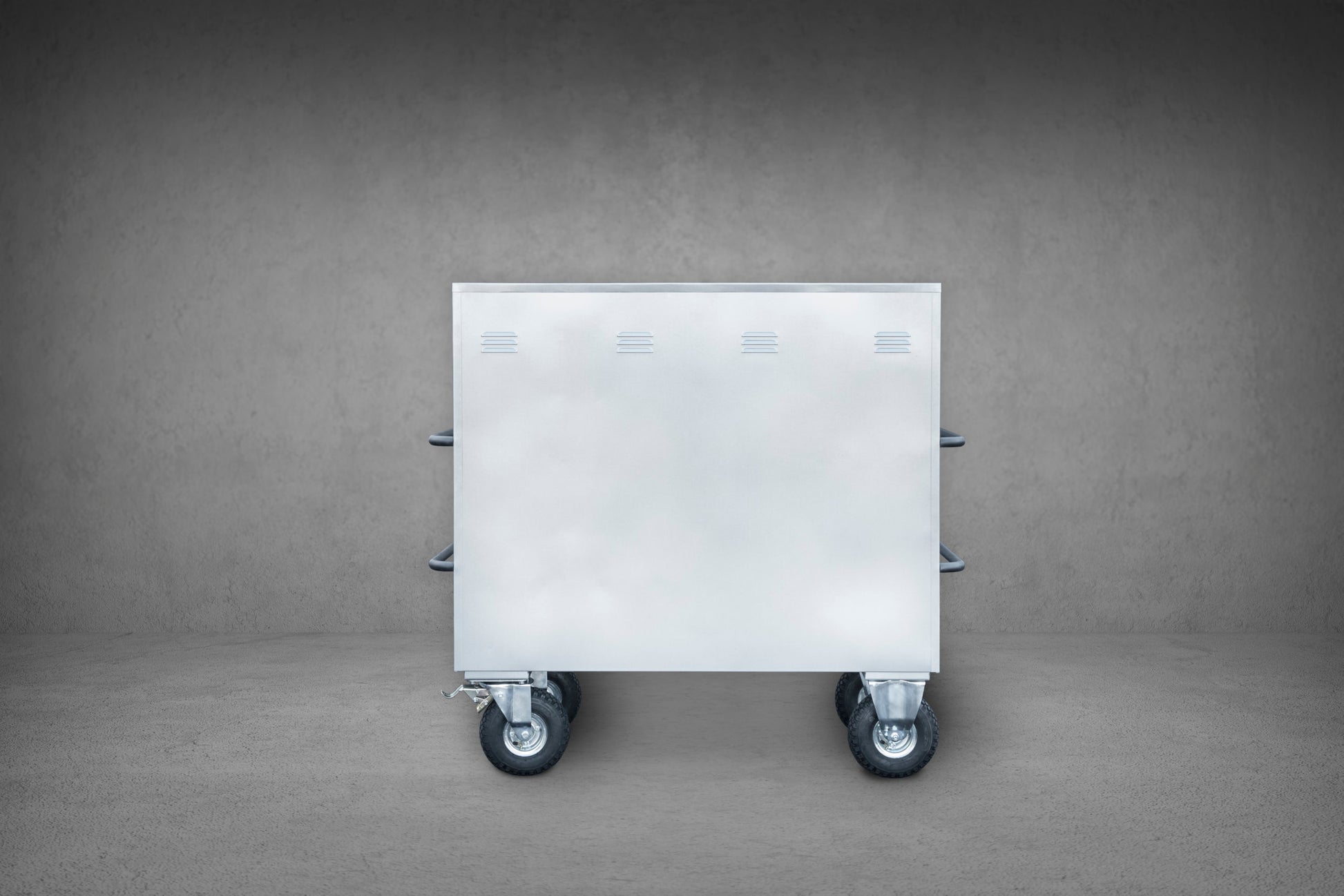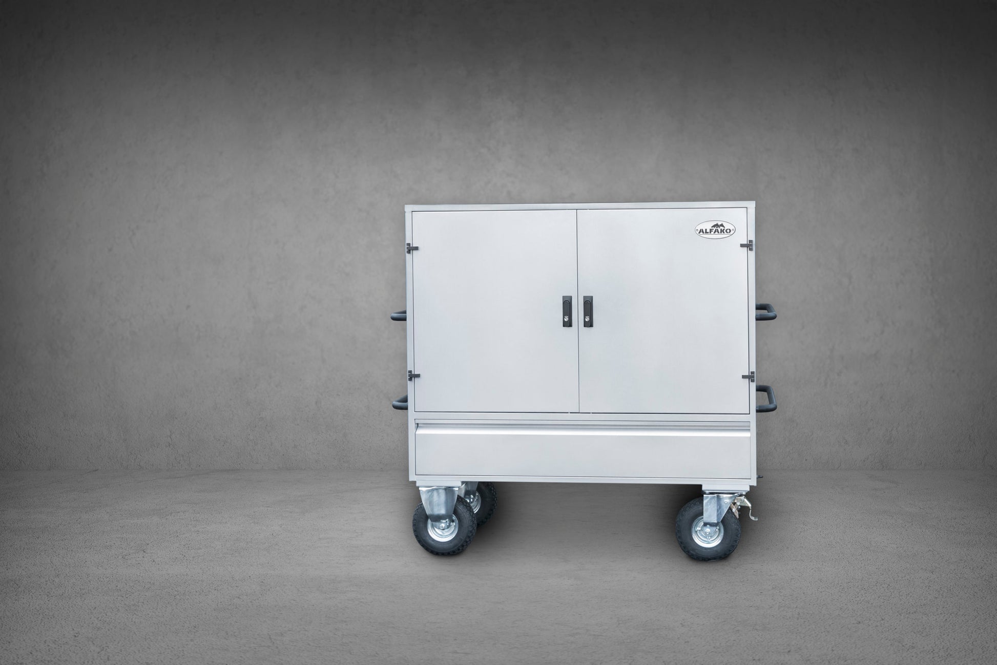 Cuatro prácticas asas y cuatro ruedas neumáticas (dos de ellas giratorias con freno de estacionamiento) de 260 mm de diámetro garantizan un manejo sencillo del armario incluso a plena carga. Opcionalmente, se ofrece un armario superior Maxi y una lona protectora a juego. Detalles técnicos: