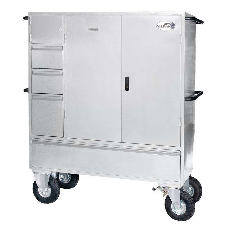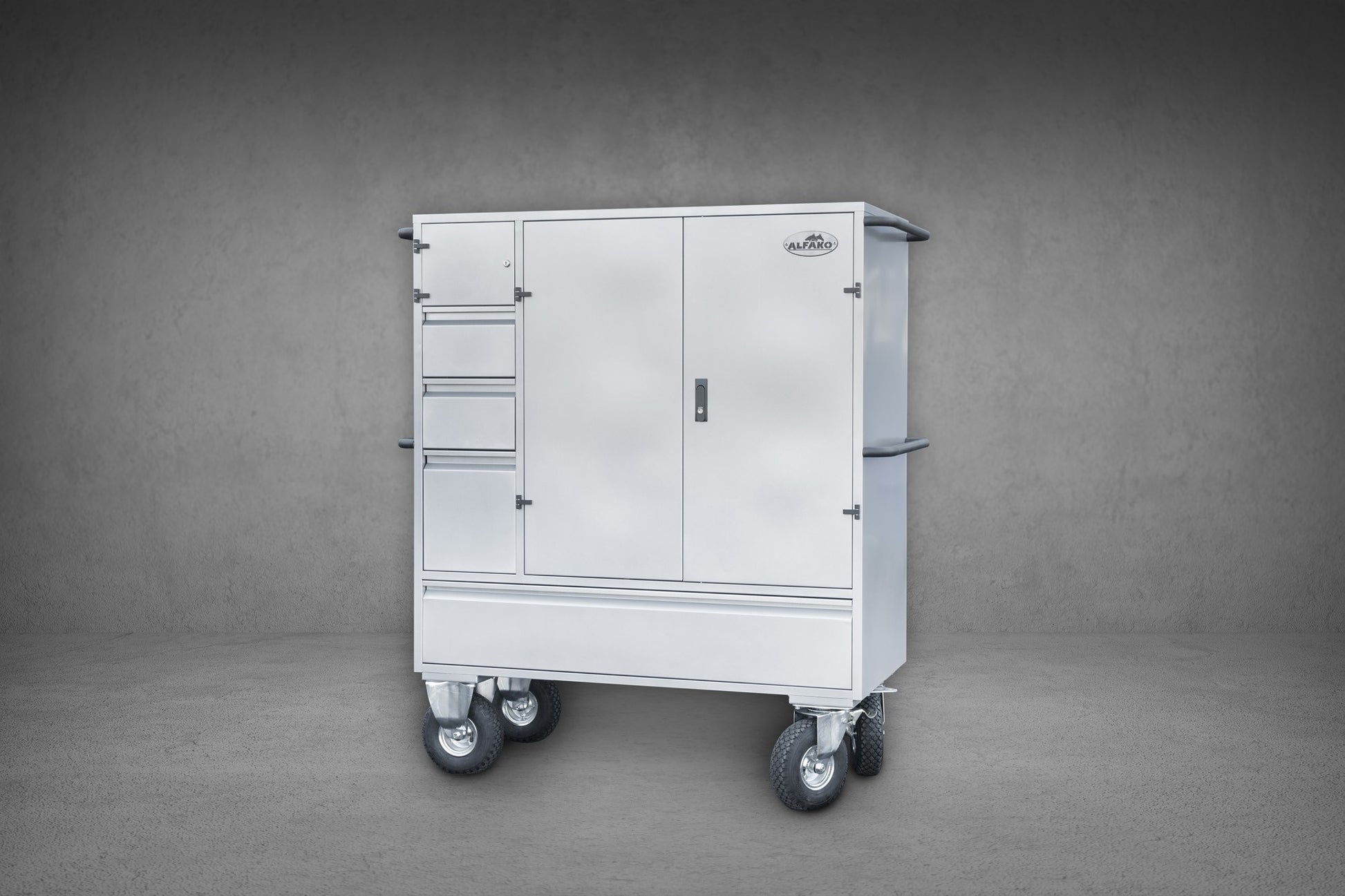 Cuatro prácticas asas y cuatro ruedas neumáticas (dos de ellas con freno de estacionamiento) garantizan que el armario se pueda mover fácilmente incluso con carga completa . Detalles técnicos: