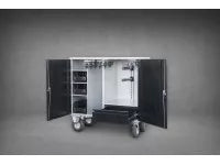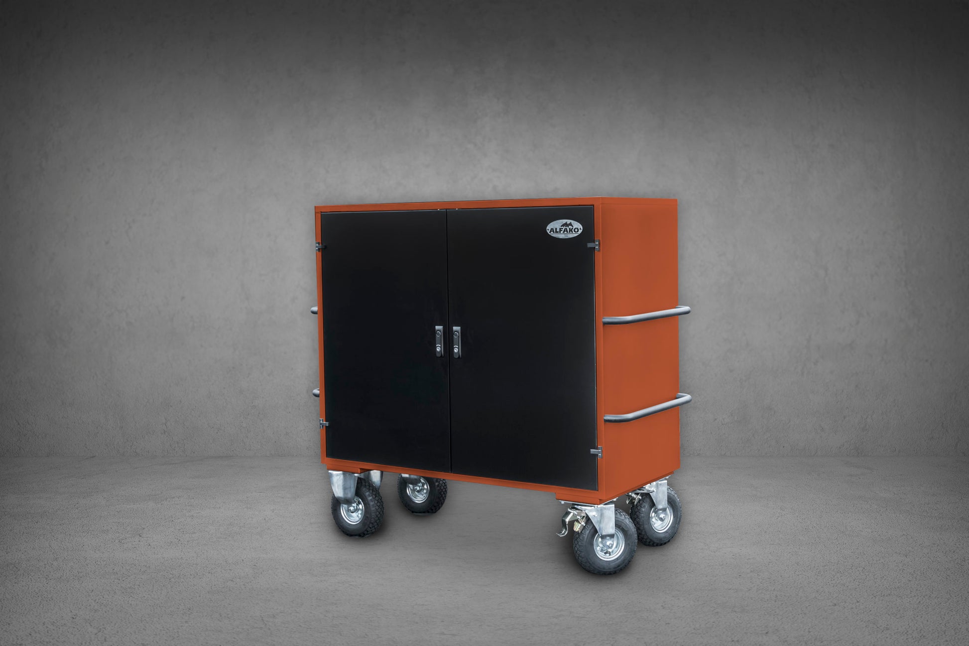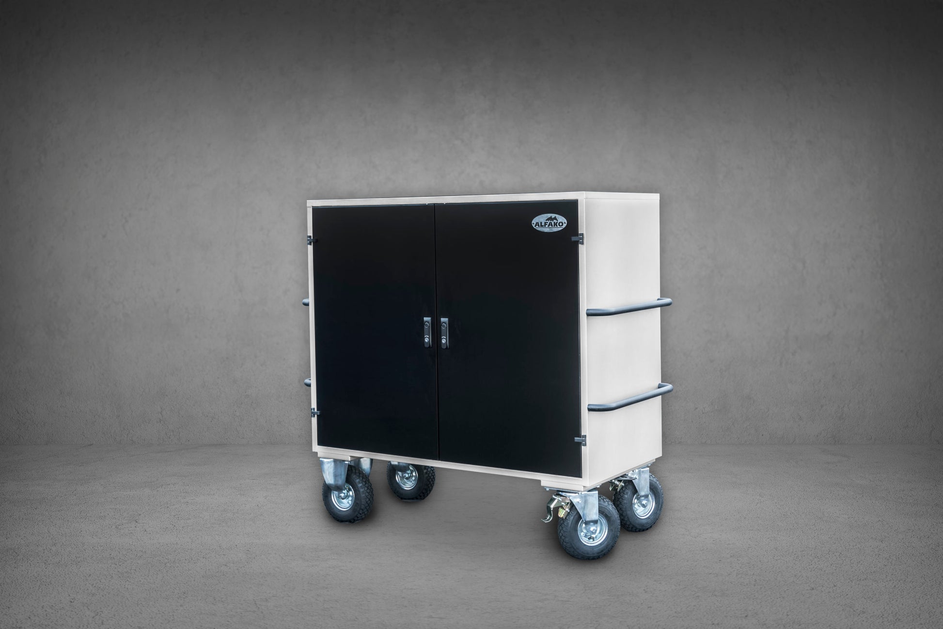 Cuatro prácticas asas y cuatro ruedas neumáticas (dos de ellas giratorias con freno de estacionamiento) de 260 mm de diámetro garantizan un manejo sencillo del armario incluso a plena carga. Opcionalmente, se ofrece un armario superior Maxi y una lona protectora a juego. Detalles técnicos: