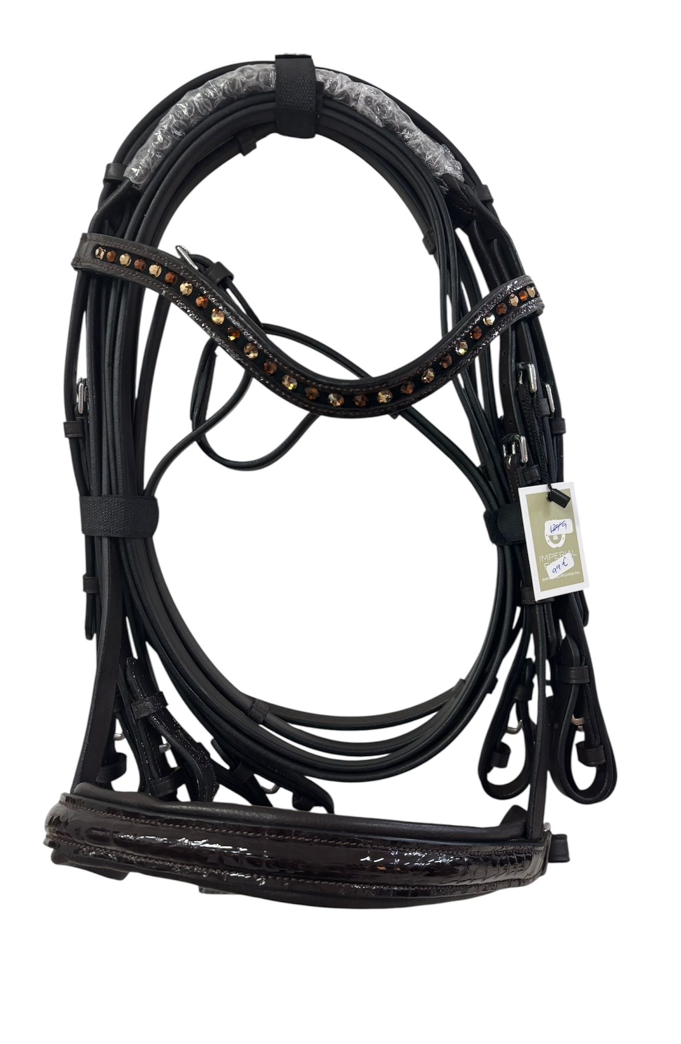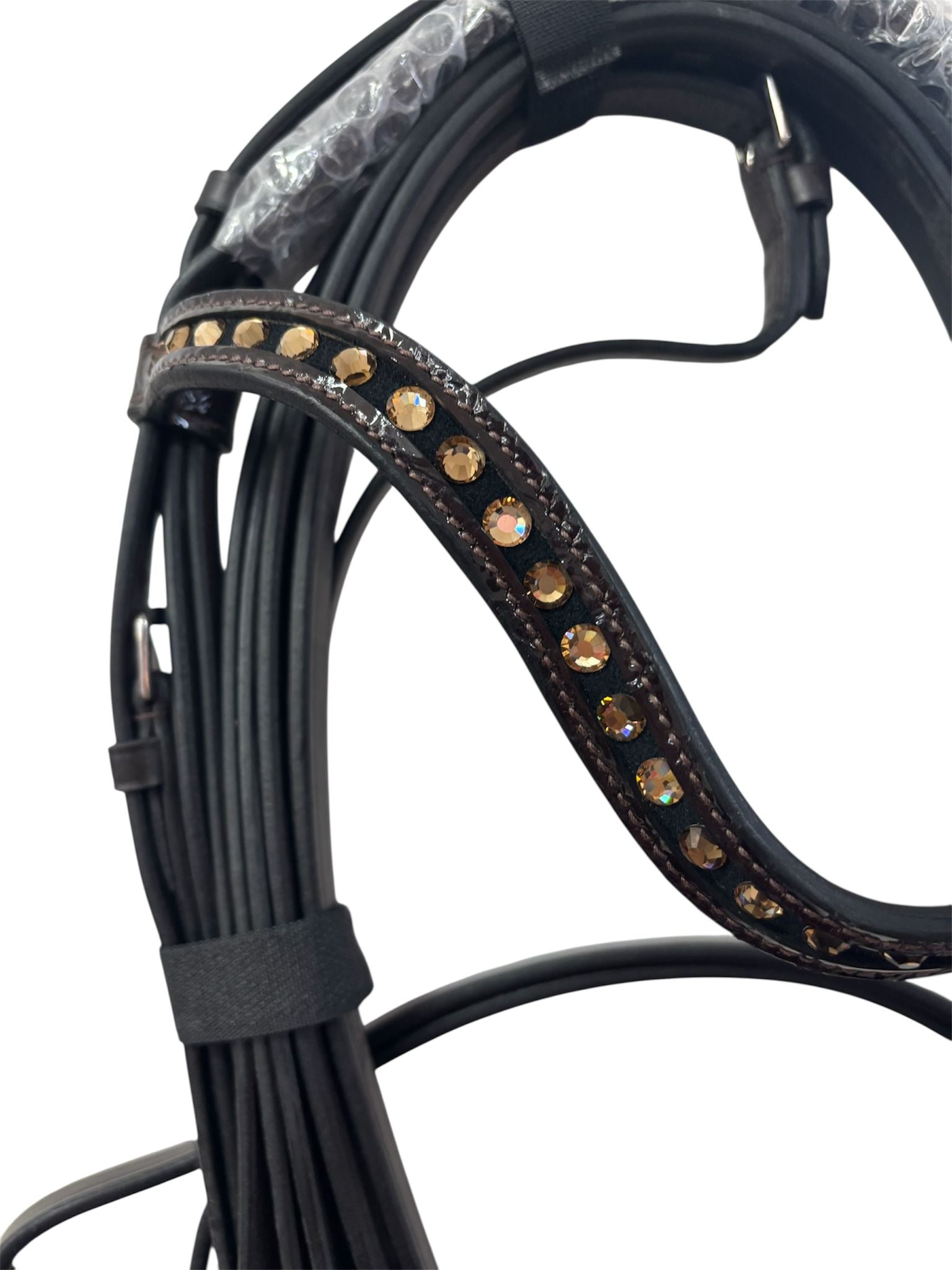 Esta hermosa cabezada doble Di Layla II está hecha de cuero de alta calidad y cuenta con una elegante muserola. Su elegante apariencia está garantizada gracias a los detalles de charol y la hermosa frontalera ondulada con pedrería. La muserola y la corona acolchadas ofrecen la máxima comodidad, y los cierres de gancho facilitan su uso. Esta cabezada incluye riendas de doble cincha. ¡Prepárate para brillar en tu próxima competición con esta impresionante cabezada!