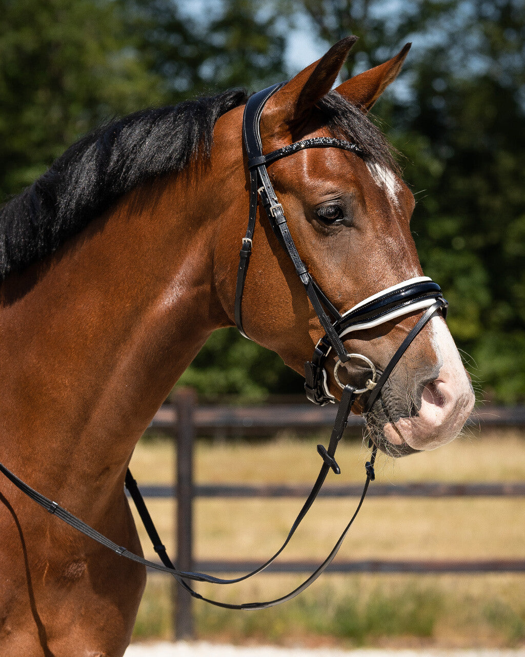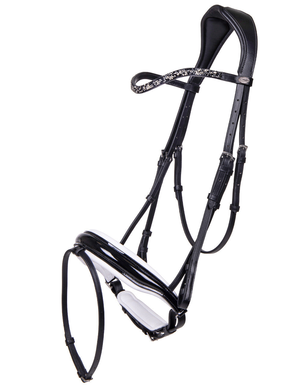 Esta elegante brida con muserola de charol es la combinación perfecta de elegancia y comodidad. La frontalera está cubierta con pedrería en forma de diamante que brillan maravillosamente. Gracias a la pieza de cabeza anatómica y a la muserola con acolchado suave, la brida es muy cómoda de llevar.