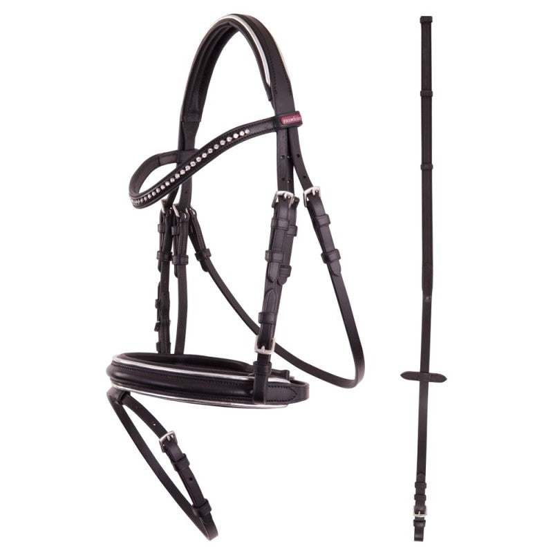 Esta brida de caballo simétrica está hecha de cuero con un hermoso acabado. Su diadema suavemente acolchada está recortada alrededor de las orejas y adornada con ribetes de charol de colores. La frontalera estrecha y curva tiene incrustaciones de diamantes de imitación de colores y presenta un revestimiento de cuero suave. La garganta se puede ajustar en ambos lados y las carrilleras están provistas de hebillas. La cabezada tiene una muserola flash (aprox. 3 cm), que está adornada con doble ribete de charol en color de contraste, similar al casco. La muserola es redonda levantada y suavemente acolchada. La brida presenta herrajes plateados brillantes hechos de acero inoxidable y viene con riendas con agarre de red en un color a juego. Las riendas están tejidas con goma para un agarre adicional. Las riendas cuentan con topes para manos y riendas y miden 17 mm de ancho.