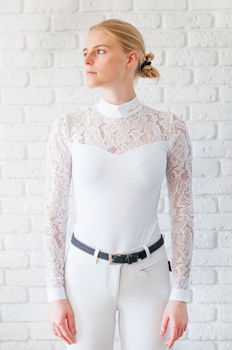 La camisa de concurso para mujer Cristall de manga larga está hecha con el mejor material, cómodo, transpirable y excepcionalmente elástico. Perfectamente ajustada, resalta la figura. Las mangas y el frente están hechos de encaje elástico premium, más agradable para la piel. Garantiza comodidad durante la competición. Tiene cristales de Swarovski dispersos delicadamente, que se muestran excepcionalmente, creando un hermoso efecto. En los puños y en el cuello hay botones decorativos en forma de flores, abrochados con un lazo elástico que permite libertad de movimiento.
