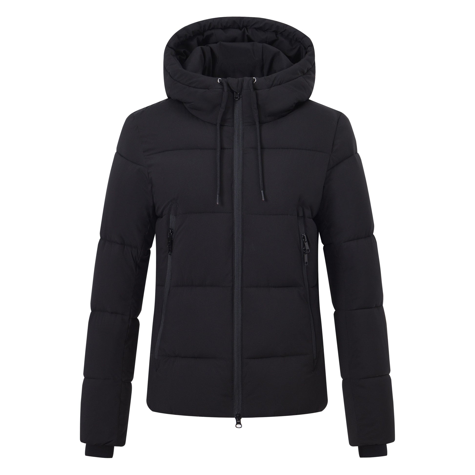 Chaqueta acolchada cálida para mujer con capucha cómoda, protector de barbilla y cordones ajustables para mayor estilo.