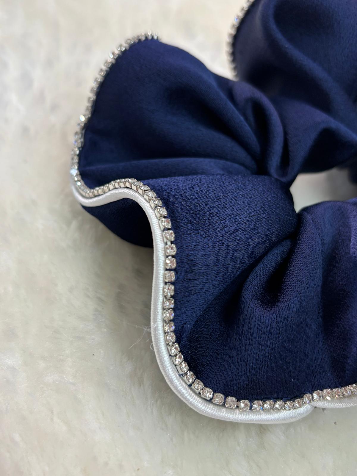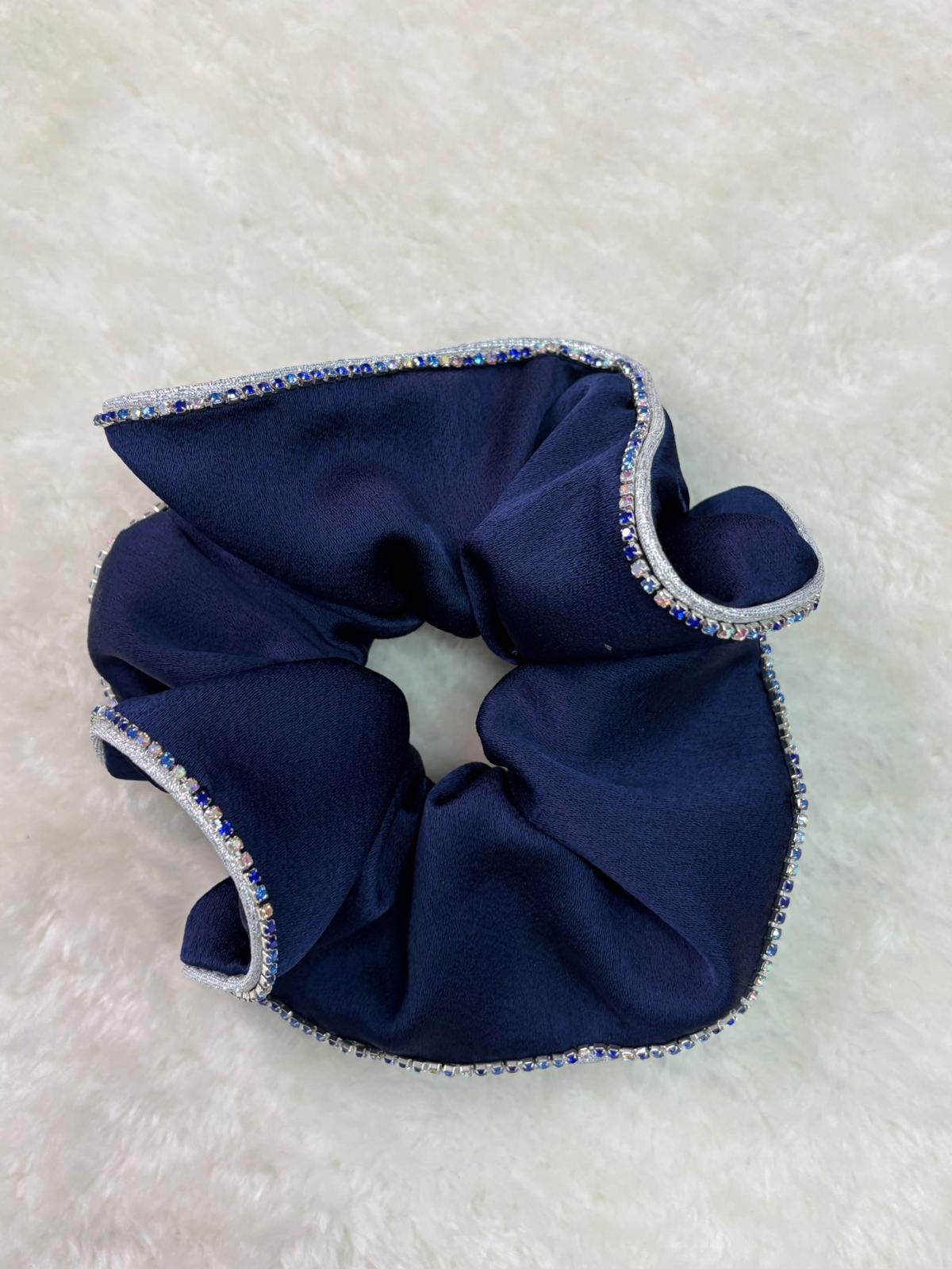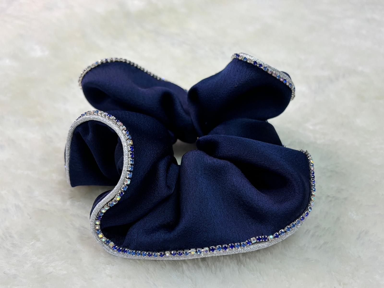 Coletero azul oscuro con ribete plateado y tira de brillantes de colores azulados
