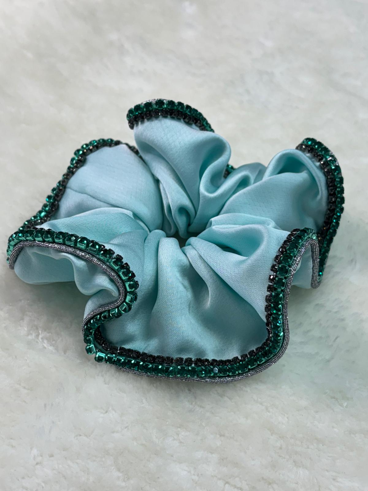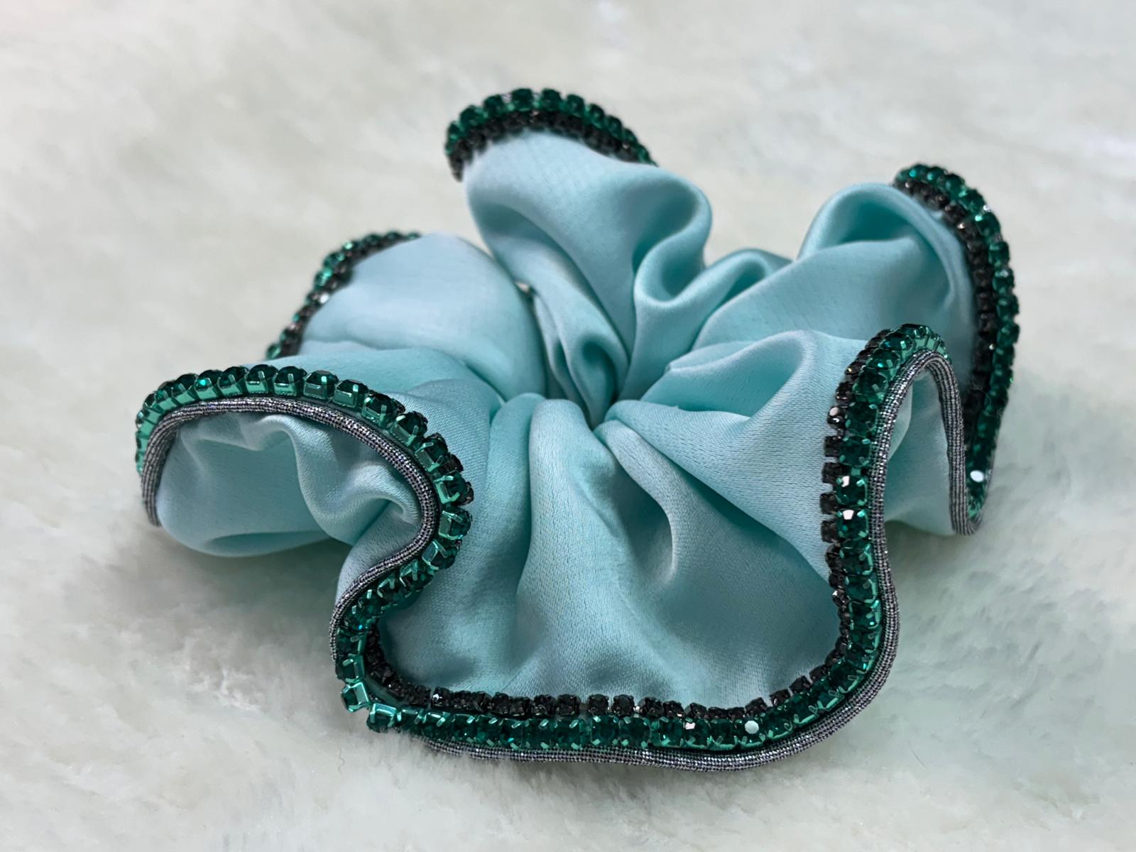Coleteros realizados a mano uno por uno con máximo cariño. Azul turquesa con dos tiras de brillantes verde esmeralda i gris oscuro