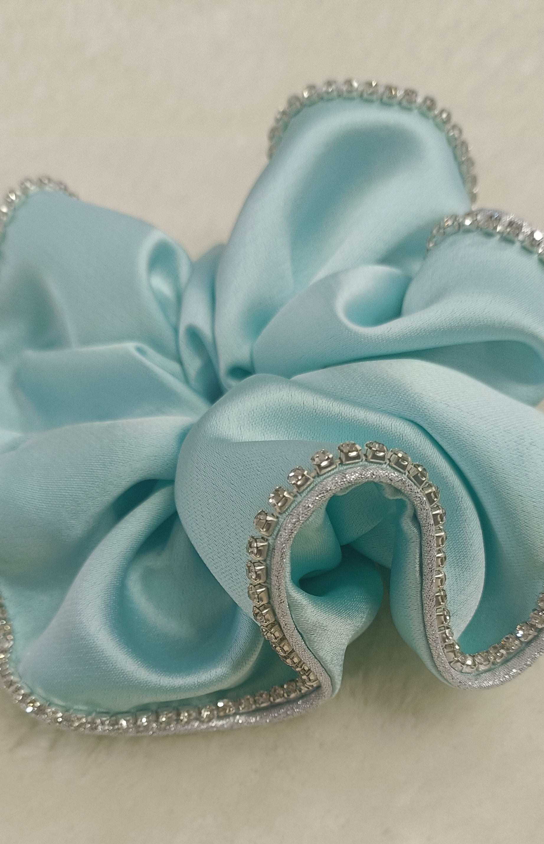 Coletero azul turquesa con ribete plateado y tira de brillantes. Realizados a mano uno por uno con máximo cariño.