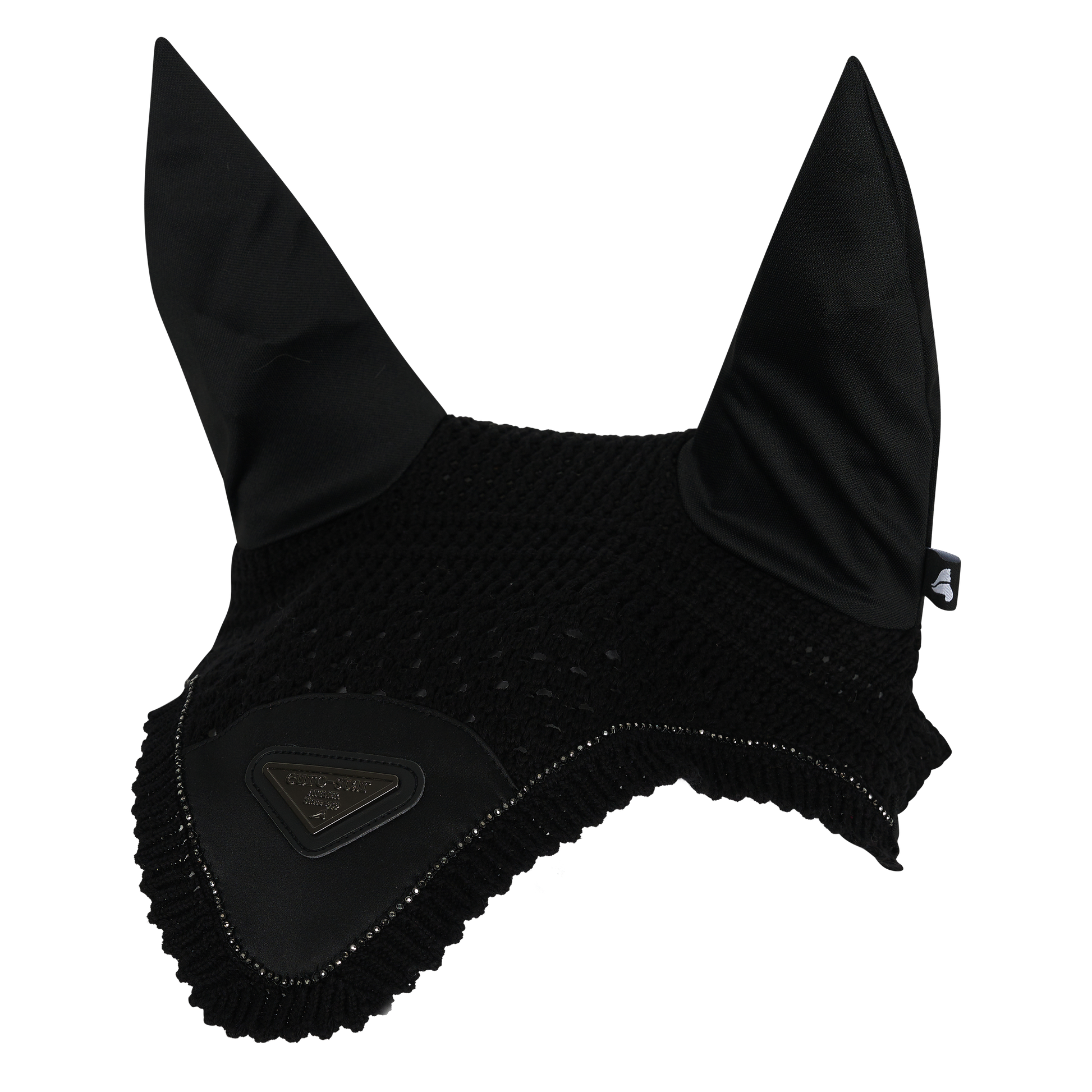 Elegante velo con tejido de crochet sofisticado, orejas elásticas, brillantes diamantes de imitación y el logotipo característico de metal.