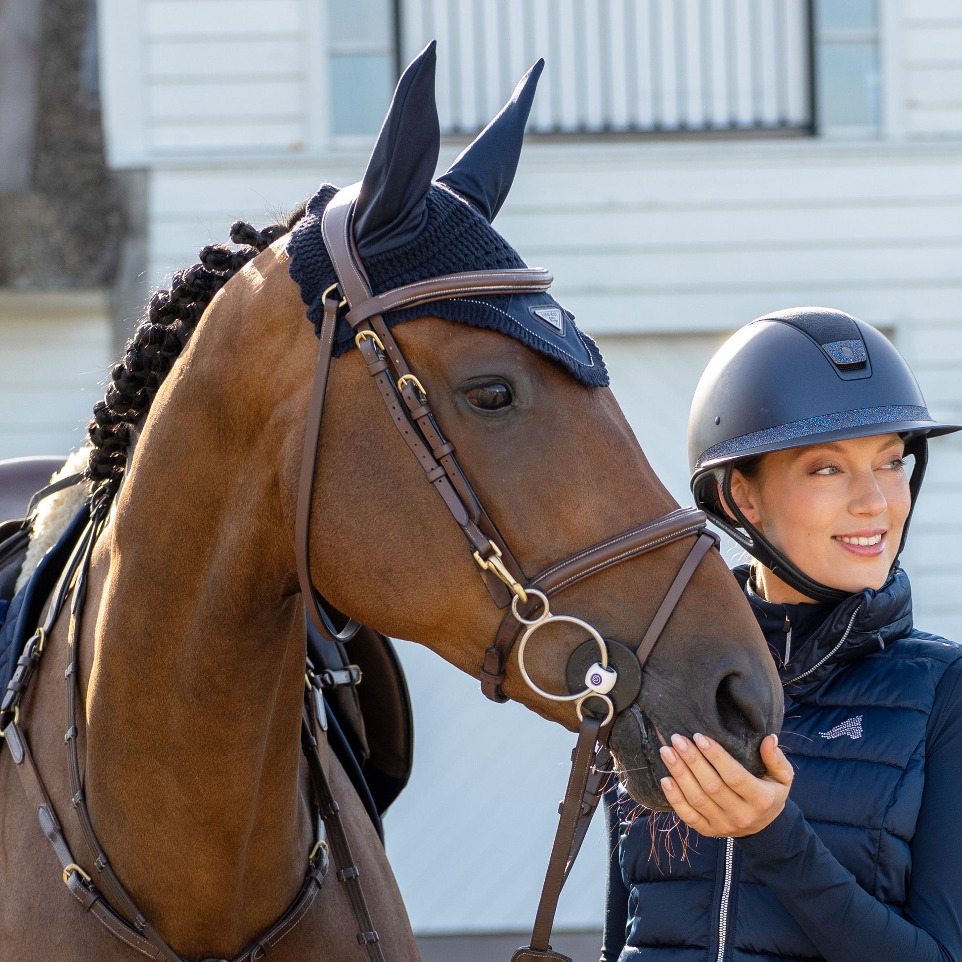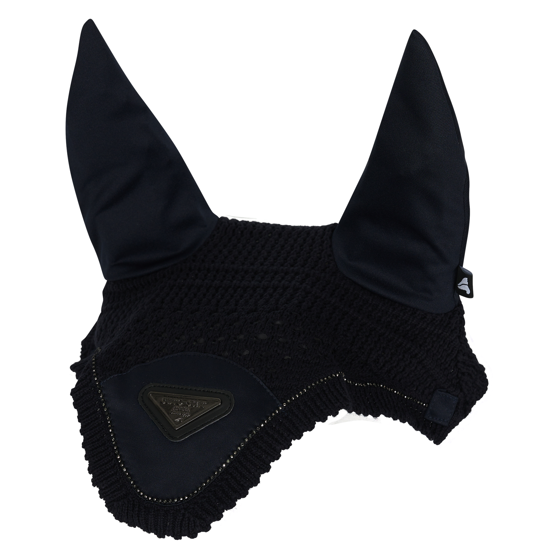 Elegante velo con tejido de crochet cómodo, orejas elásticas, brillantes diamantes de imitación y el logotipo característico de metal.