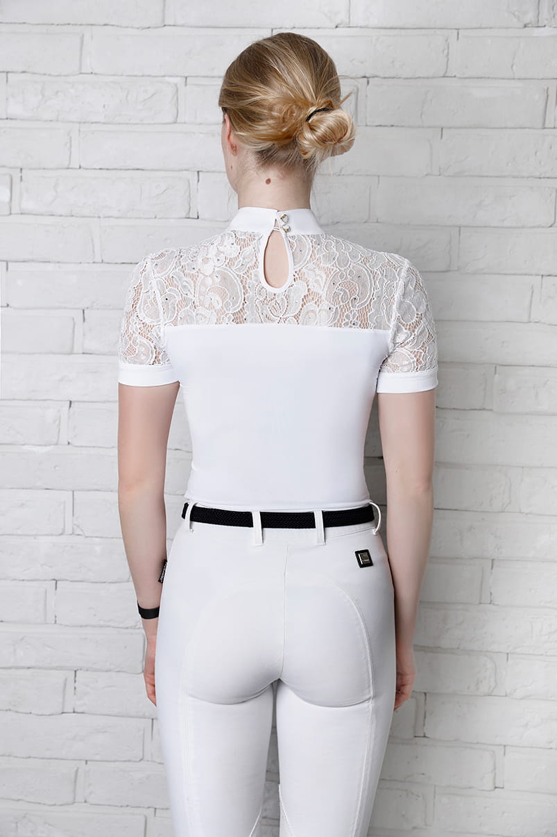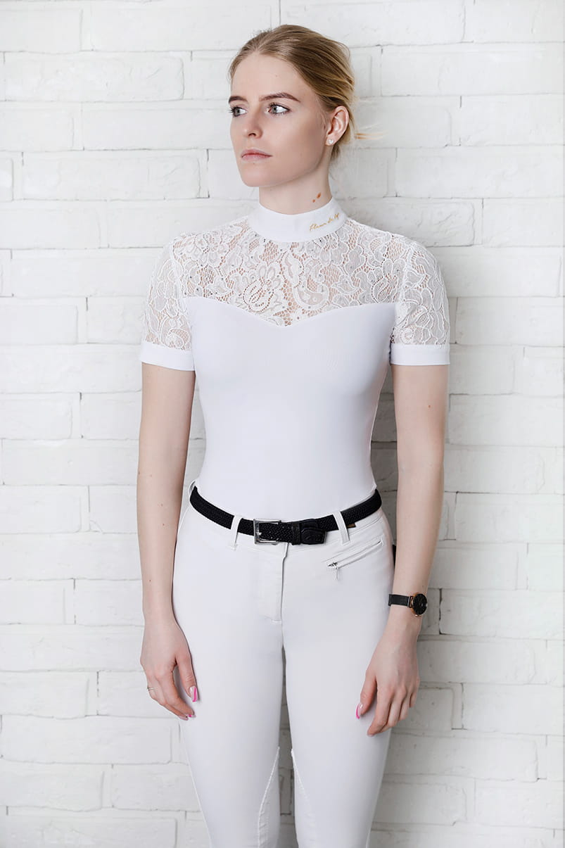En respuesta a sus sugerencias, hemos creado una versión con mangas cortas. Hecha con el mejor material deportivo de calidad, cómodo, transpirable y excepcionalmente elástico. Perfectamente ajustada, resalta la figura. Las mangas y el frente están hechos de encaje elástico premium, agradable para la piel. Garantiza comodidad durante la competición. Tiene cristales de Swarovski dispersos delicadamente y pegados a mano, que brillan de manera excepcional, creando un hermoso efecto. La blusa se ve impresionante tanto debajo de un frac de competición como por sí sola.