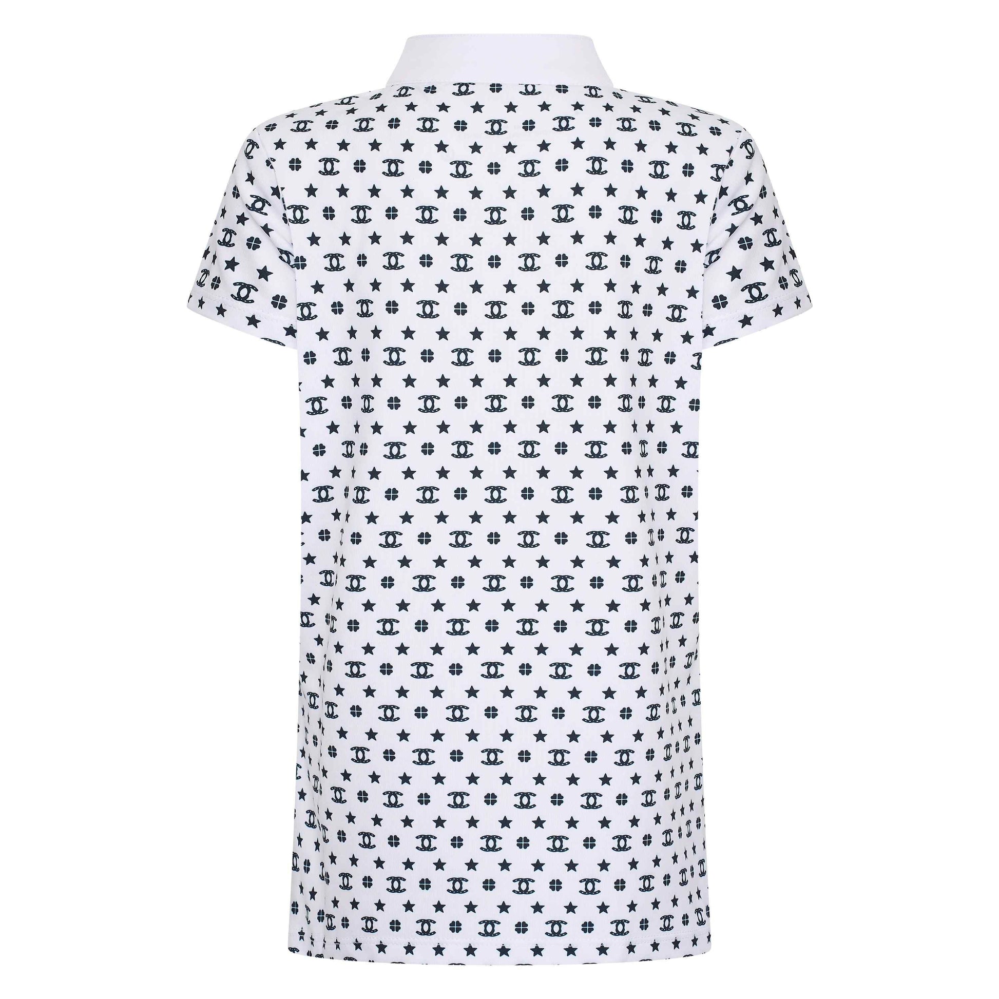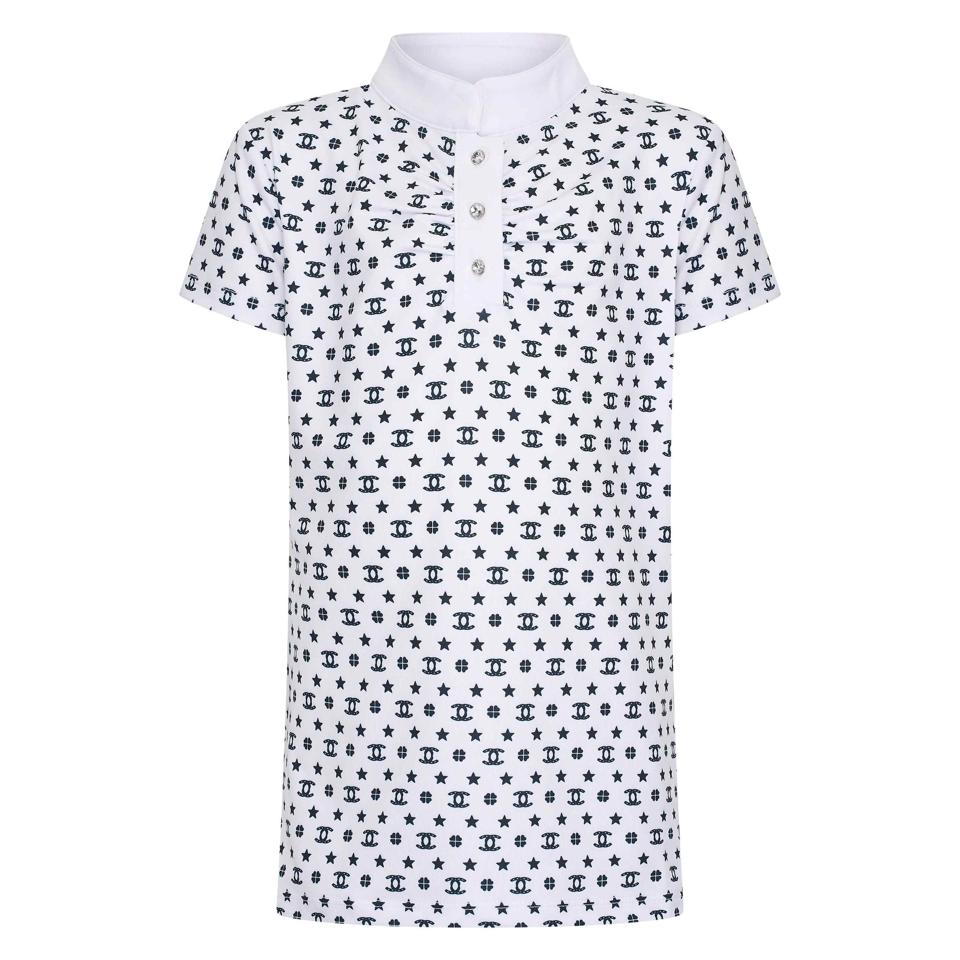 Top de competición * Cuerpo y mangas en color blanco con estampado azul marino * Cuello blanco con logo de IMPERIAL RIDING en la espalda central * Frente central con abertura corta con elegantes botones de diamantes de imitación * Fruncido en el pecho.