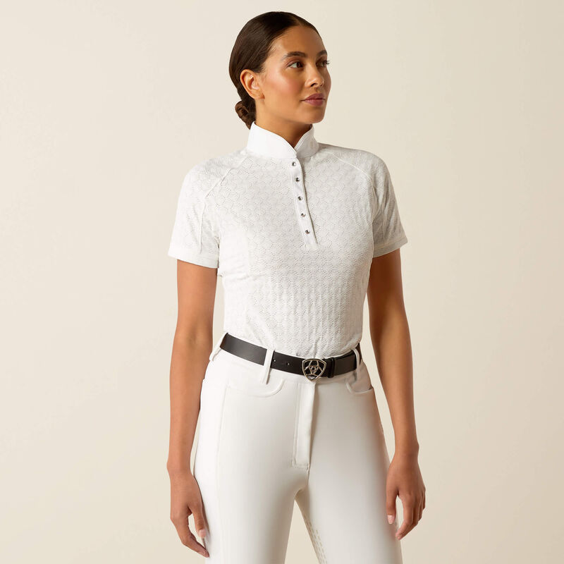 Destaca y mantente fresco esta temporada de espectáculos con Showstopper X. Confeccionada con tela de malla floral transpirable con la elasticidad perfecta y terminada con broches de cristal y un logotipo brillante, es una versión mejorada de nuestra camiseta de espectáculo adorada por los jinetes