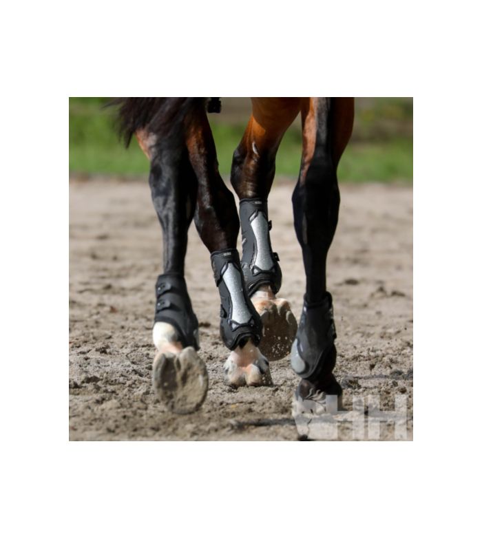 De hecho, el inserto especial de Fibra de Carbono (patentado y, por primera vez, brillante) mejora la capacidad protectora del protector manteniendo la máxima flexibilidad y adaptabilidad a las extremidades del caballo.