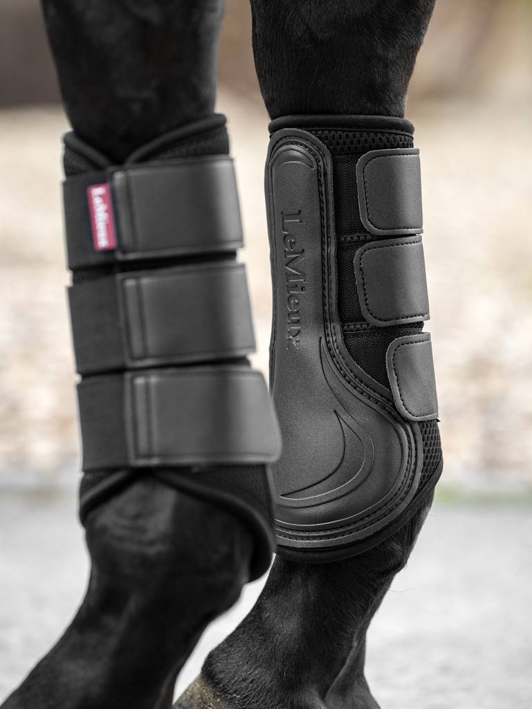 Botas de cepillado de excelente calidad e increíblemente inteligentes para entrenamiento y competición, ahora con una protección actualizada con la marca LeMieux en relieve. Este panel reforzado, resistente y duradero, protege el interior de la pata de su caballo contra golpes y raspones causados por el cepillado, sin añadir peso ni volumen excesivos.