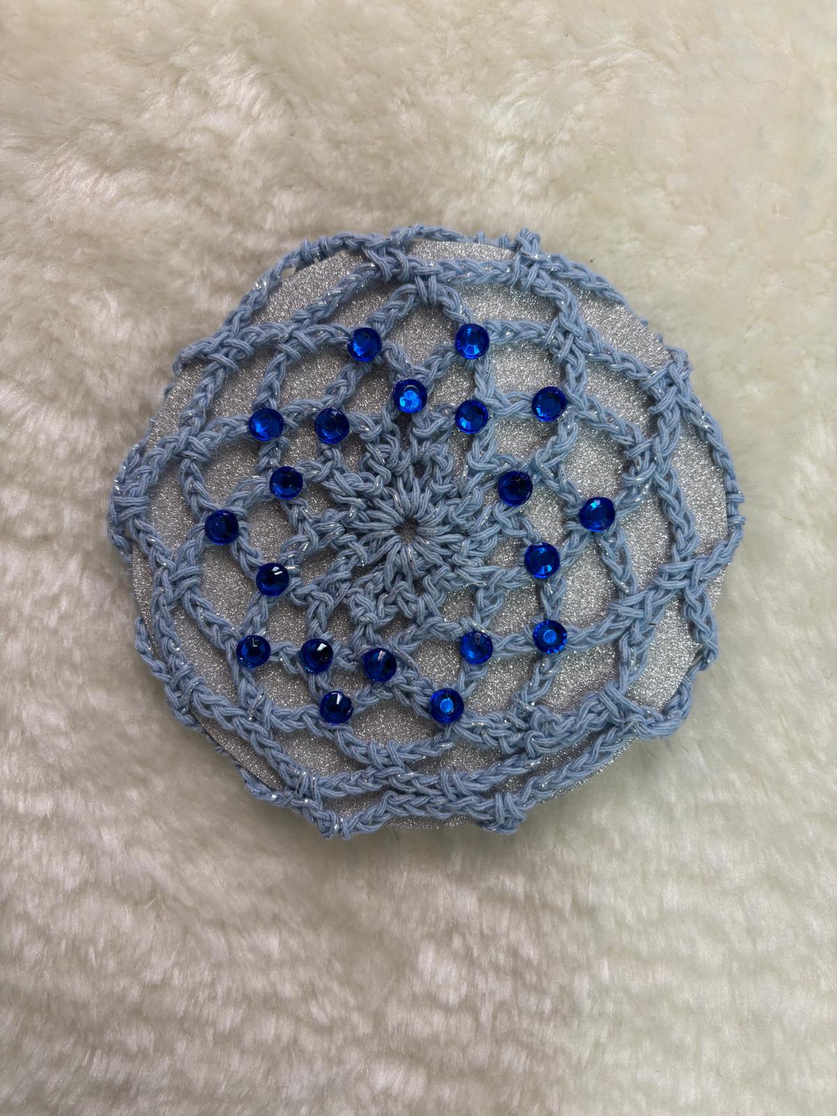 Elegante red hecha a mano de color azul claro con brillantes aplicados que se ajusta perfectamente al cabello recogido.