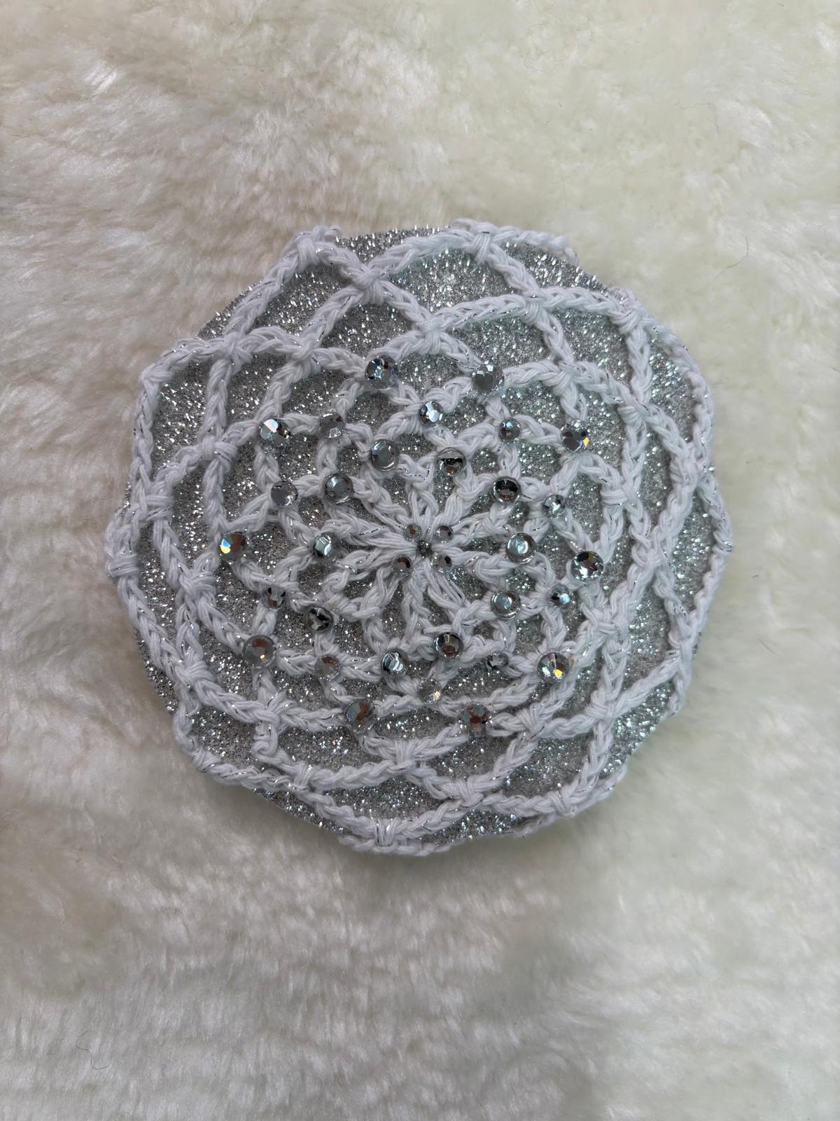 Elegante red hecha a mano de color blanco con brillantes aplicados que se ajusta perfectamente al cabello recogido.