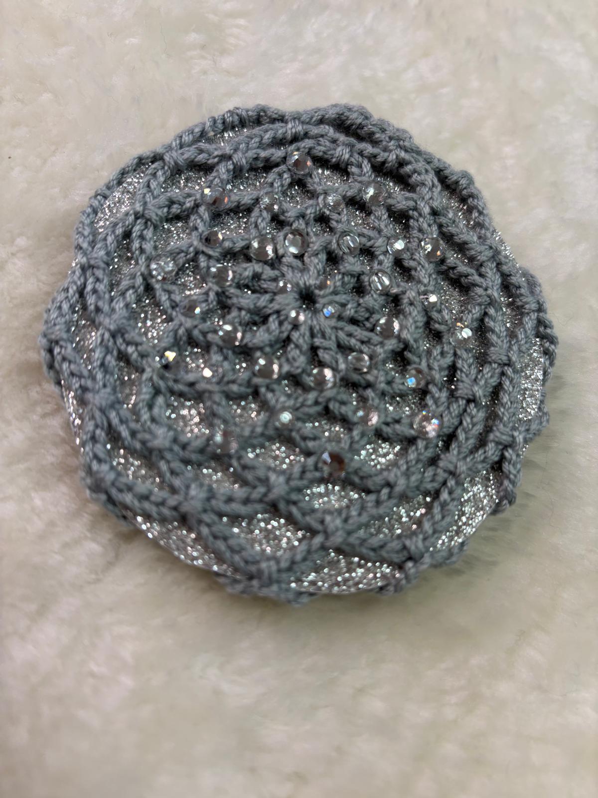 Elegante red hecha a mano de color gris con brillantes aplicados que se ajusta perfectamente al cabello recogido.